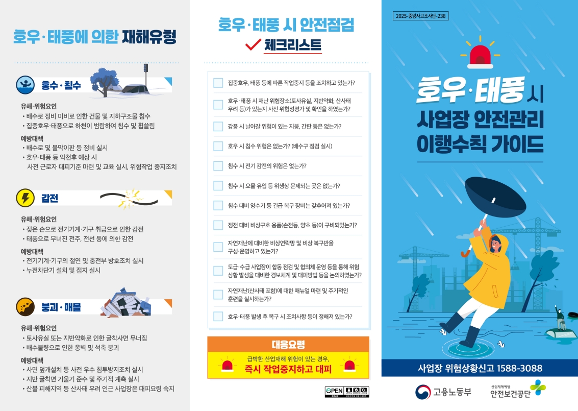 안전보건공단 산업안전포털 안전보건자료실에 [태풍·호우 시 사업장 안전관리 이행수칙 가이드] 자료가 게시되었습니다.