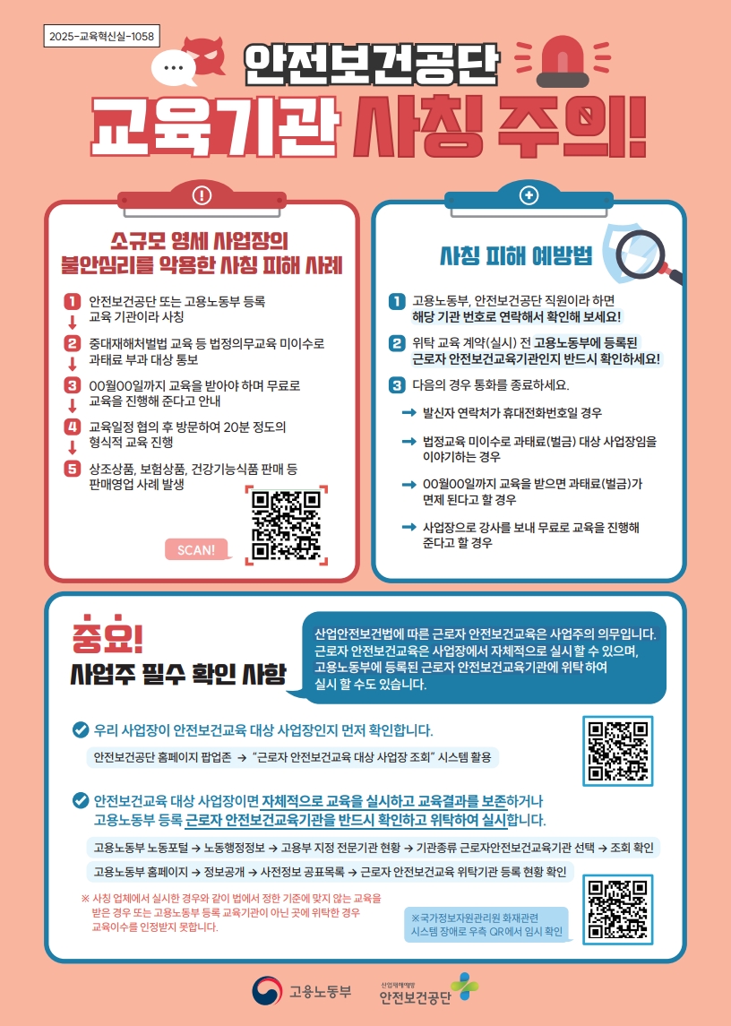 안전보건공단에서 제공하는 [안전보건교육기관 사칭 주의 안내] 리플릿을 게시하오니 업무에 참고하시기 바랍니다.